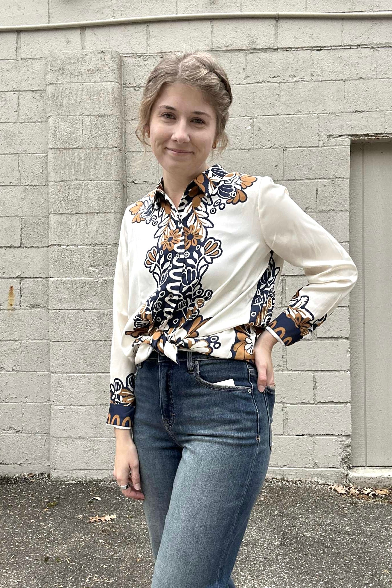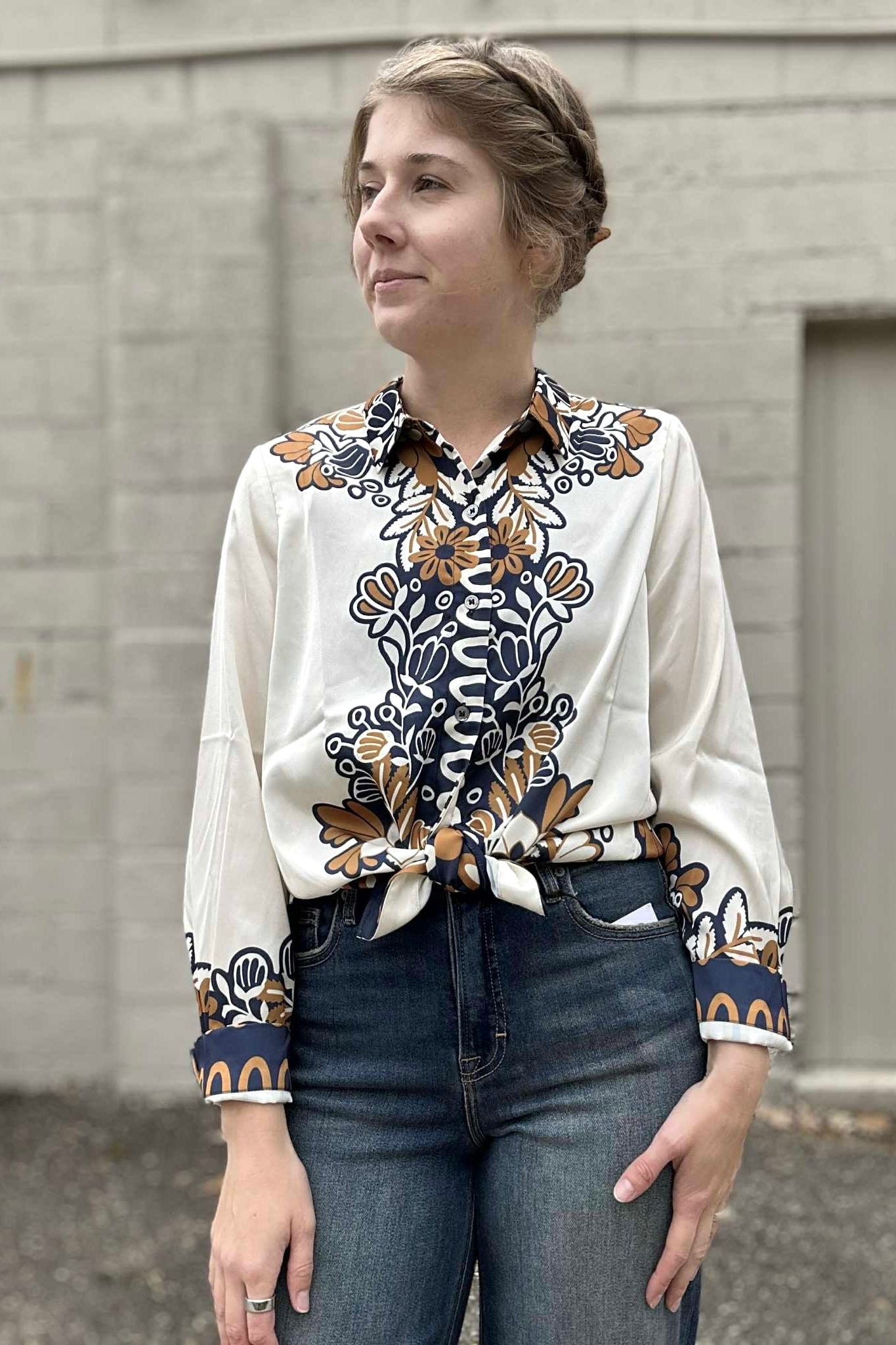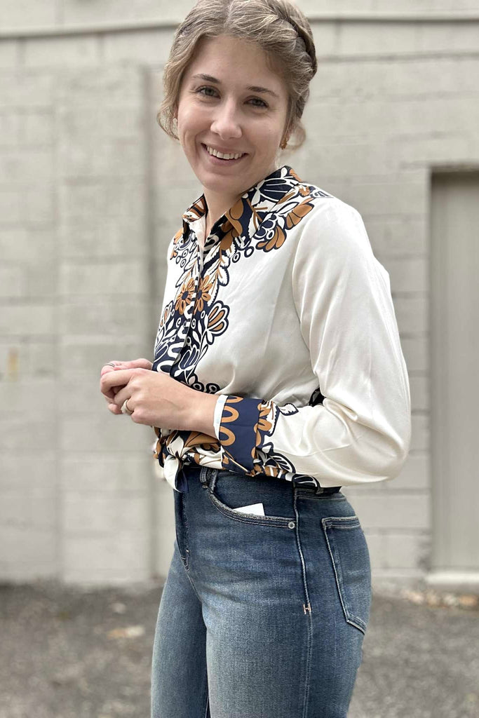 Say hello to your new favorite blouse! This cream canvas comes alive with a gorgeous printed design featuring delicate florals and intricate patterns in navy, mocha, mustard, and cream. The classic collar adds polish while patterned cuffs echo the design for a cohesive, thoughtfully styled look. Whether you're heading to brunch or the office, this versatile piece brings color and personality to any outfit without trying too hard.