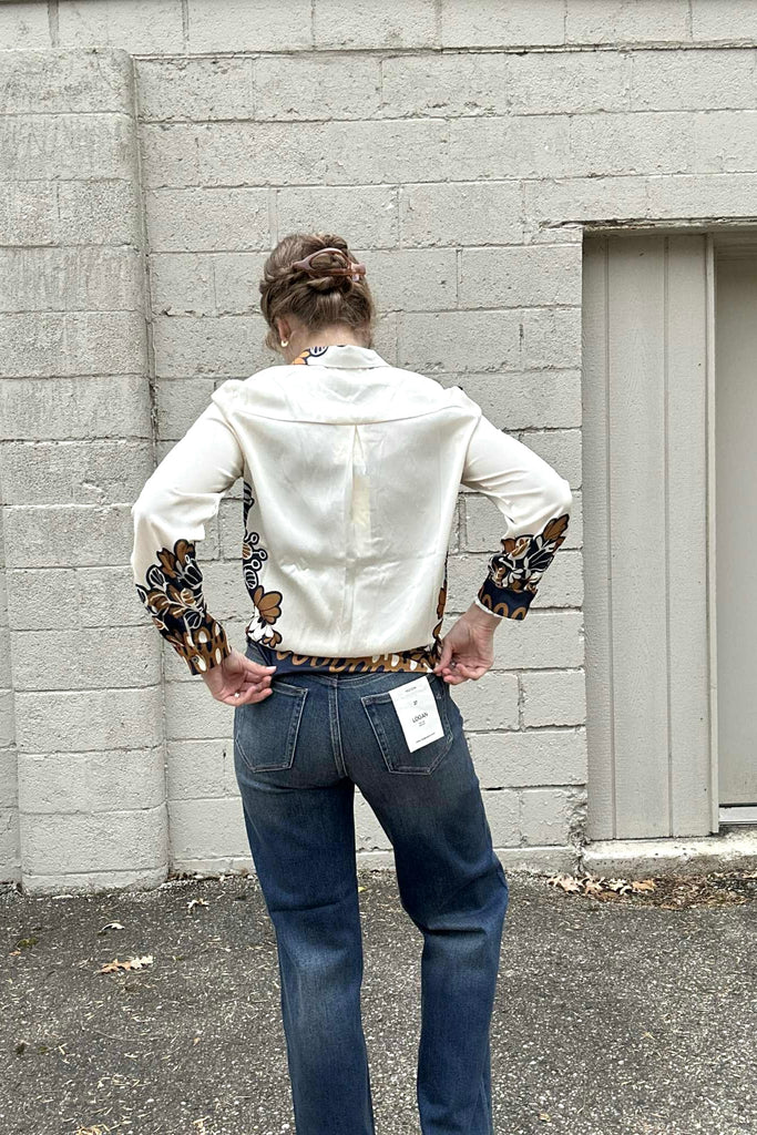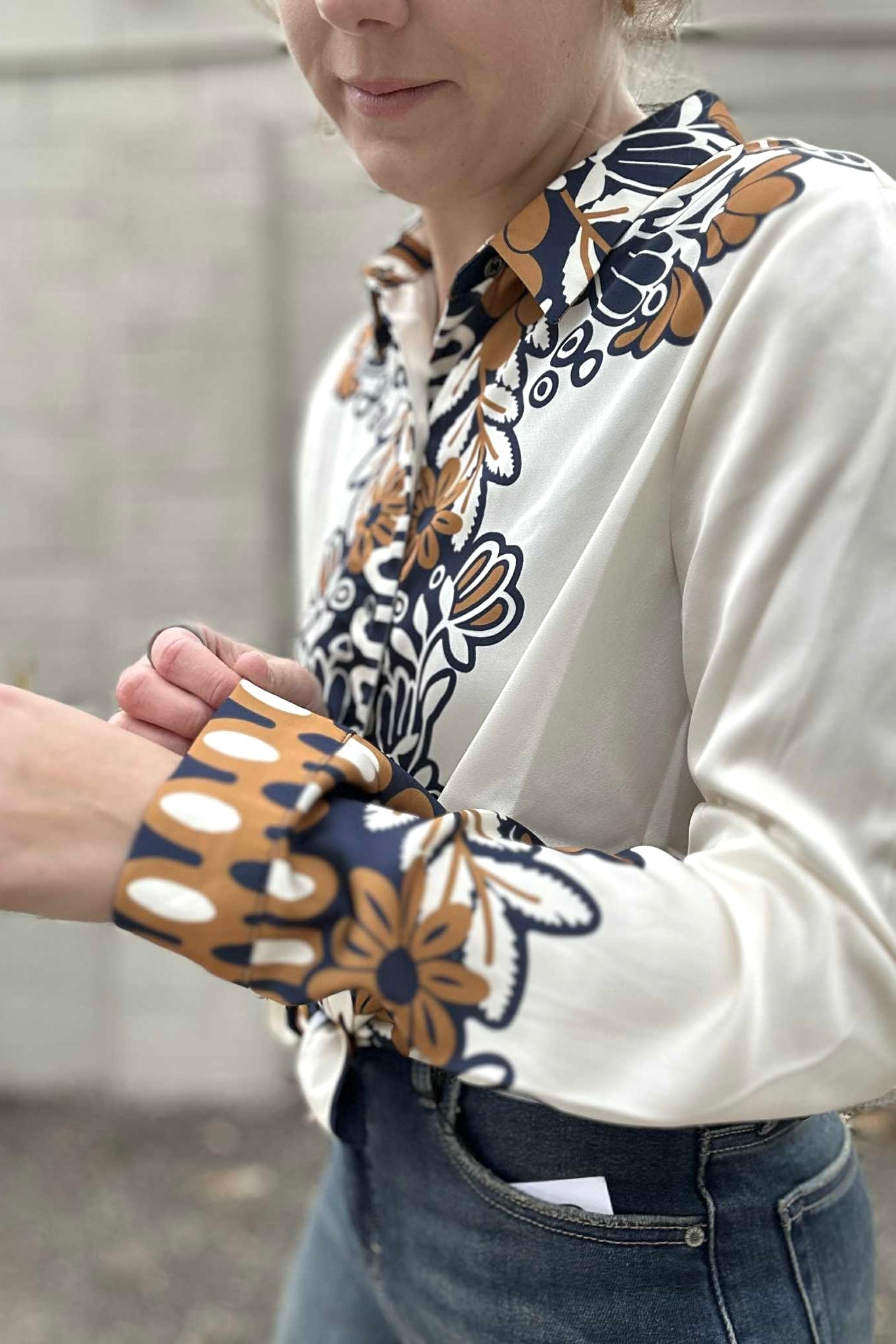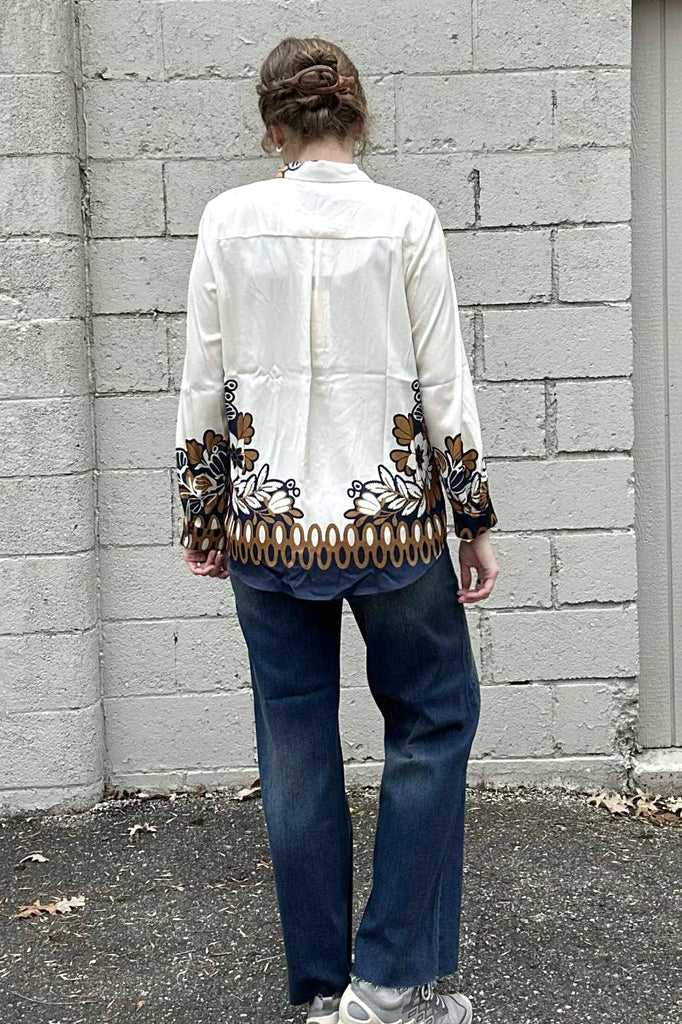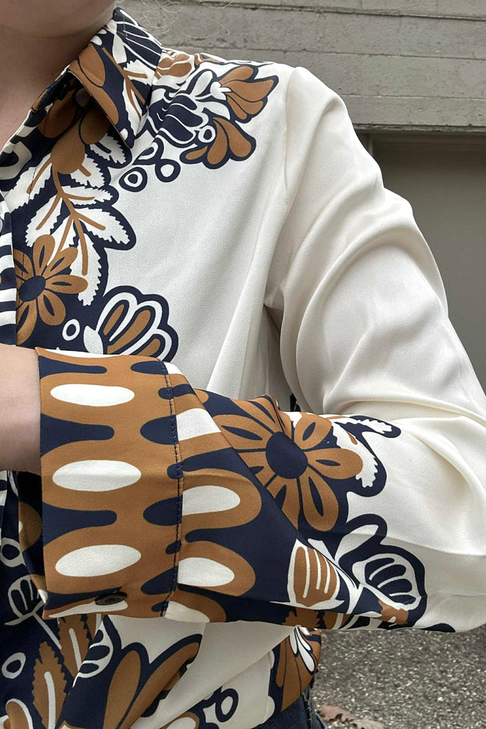 Say hello to your new favorite blouse! This cream canvas comes alive with a gorgeous printed design featuring delicate florals and intricate patterns in navy, mocha, mustard, and cream. The classic collar adds polish while patterned cuffs echo the design for a cohesive, thoughtfully styled look. Whether you're heading to brunch or the office, this versatile piece brings color and personality to any outfit without trying too hard.