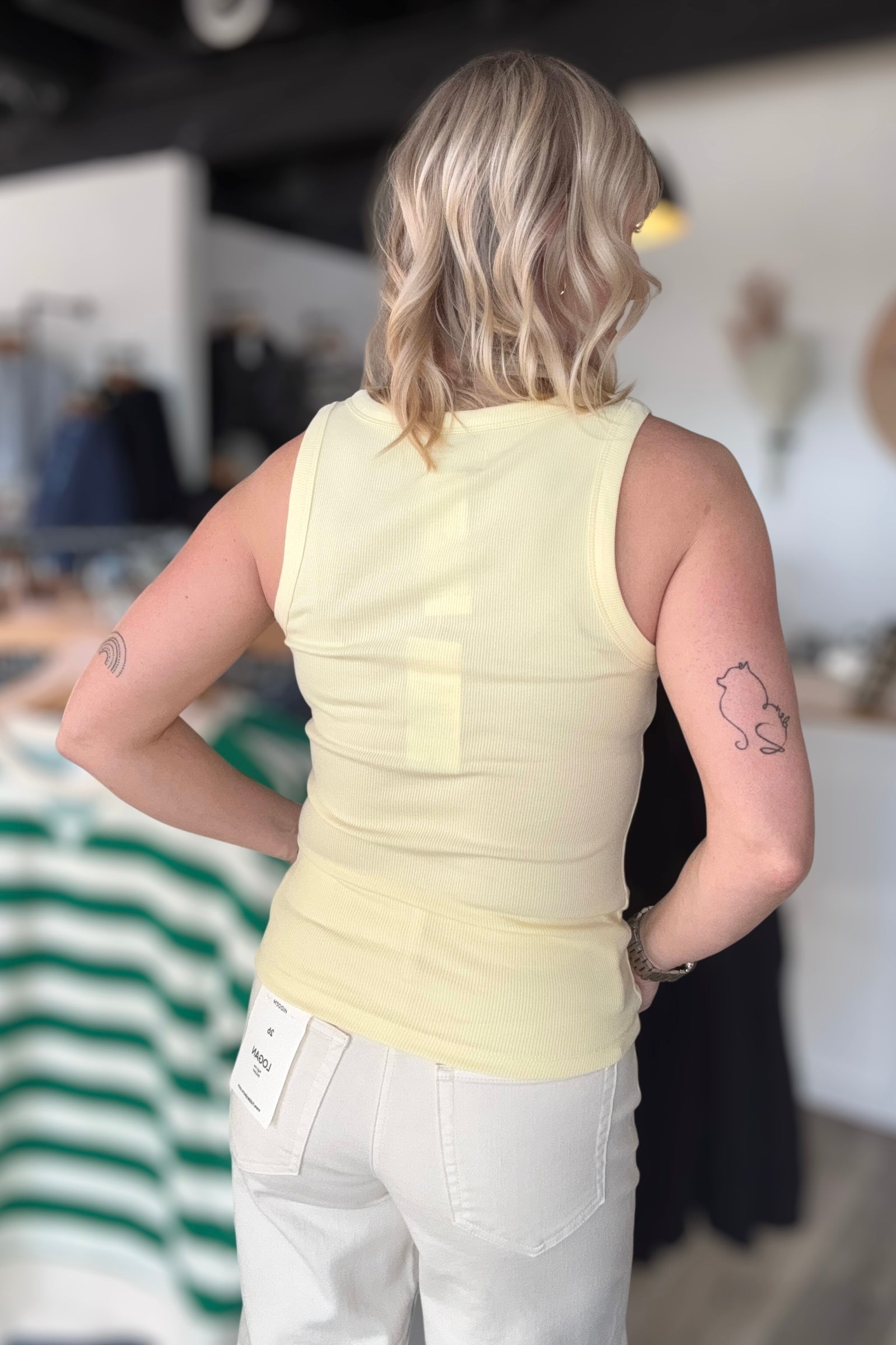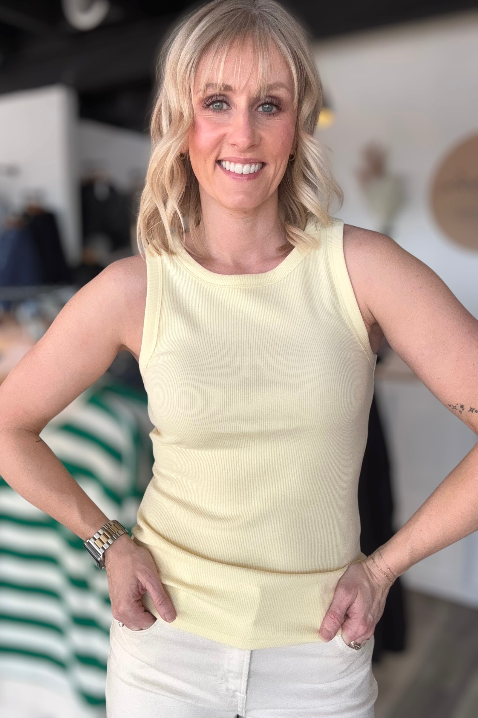Butter yellow never looked so good. This ribbed tank features thicker straps and a classic round neck that works over time. Layer it under everything or let it shine solo. The longer torso length keeps you covered while the relaxed fit transitions seamlessly from casual weekend vibes to dressed-up evenings. Perfect for summer, this versatile essential proves that sometimes the simplest pieces make the biggest impact.