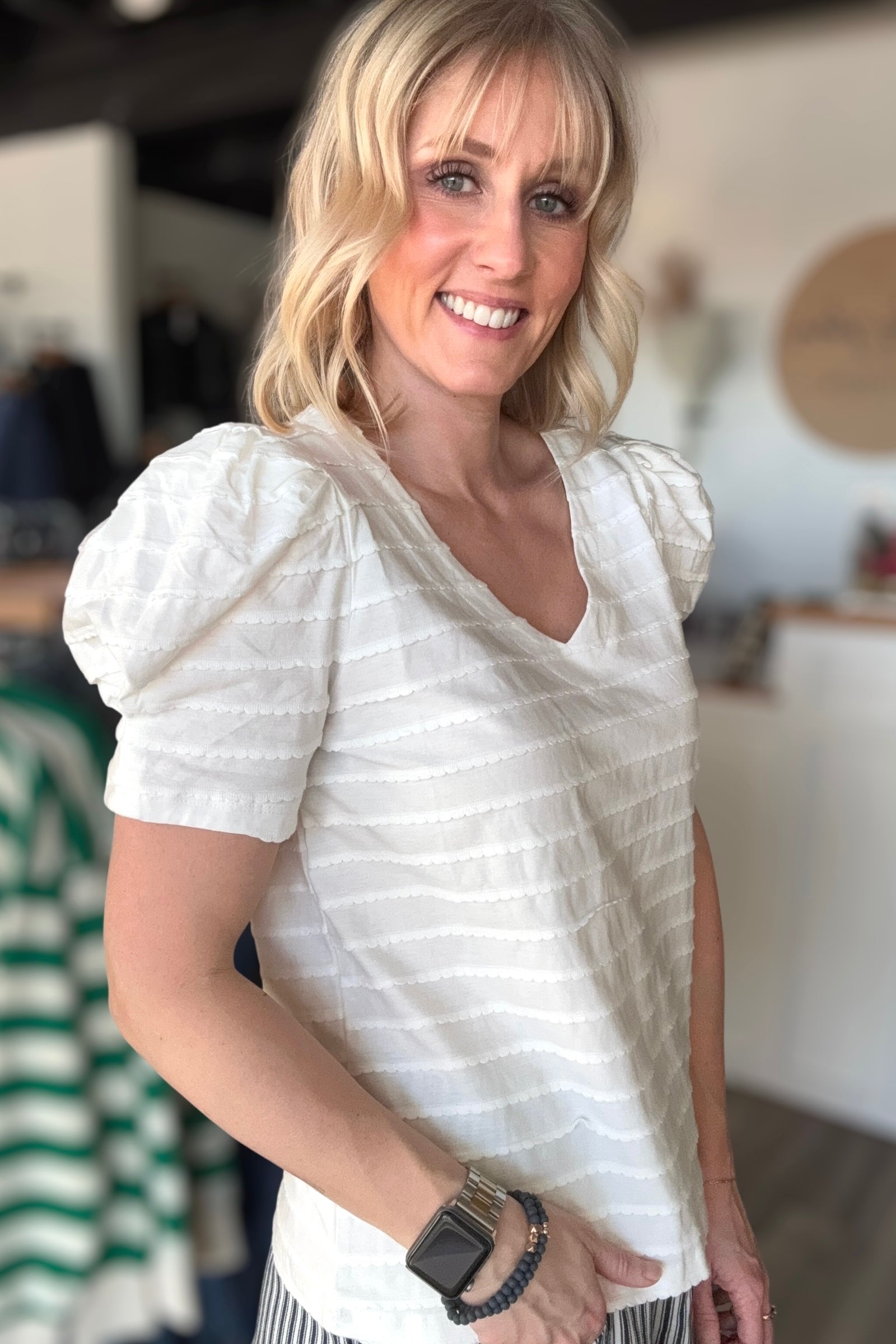 Meet your new favorite top—a playful white v-neck that's all about feel-good style. Luxuriously soft with textured detailing that adds depth and movement, it features charming puff sleeves and extended length for that just-right coverage. The fabric's subtle texture brings understated sophistication while remaining wonderfully wearable. Layer it, wear it solo, or throw it on for anything from brunch to casual evenings. This is the kind of piece that becomes an instant go-to in your rotation.