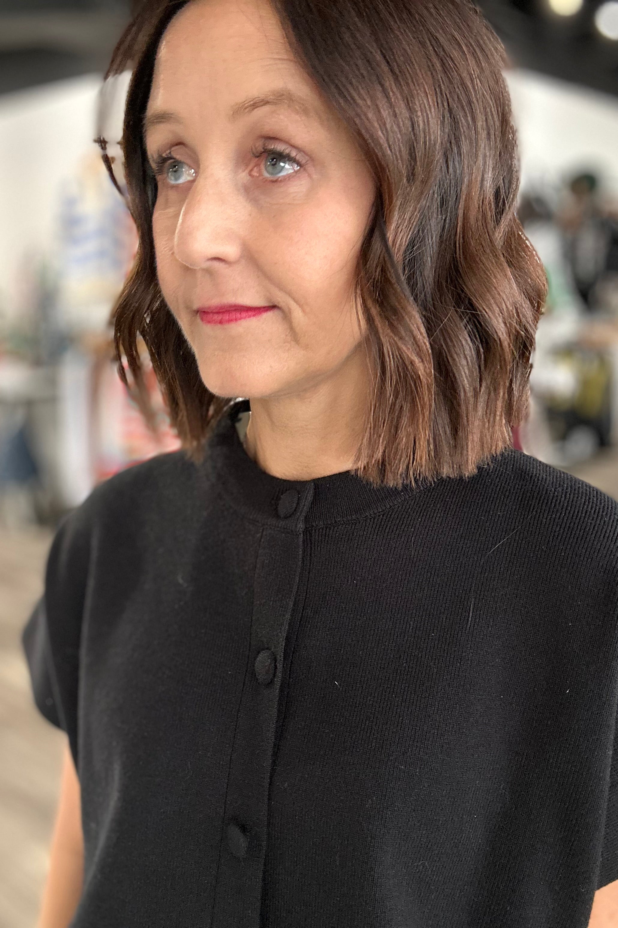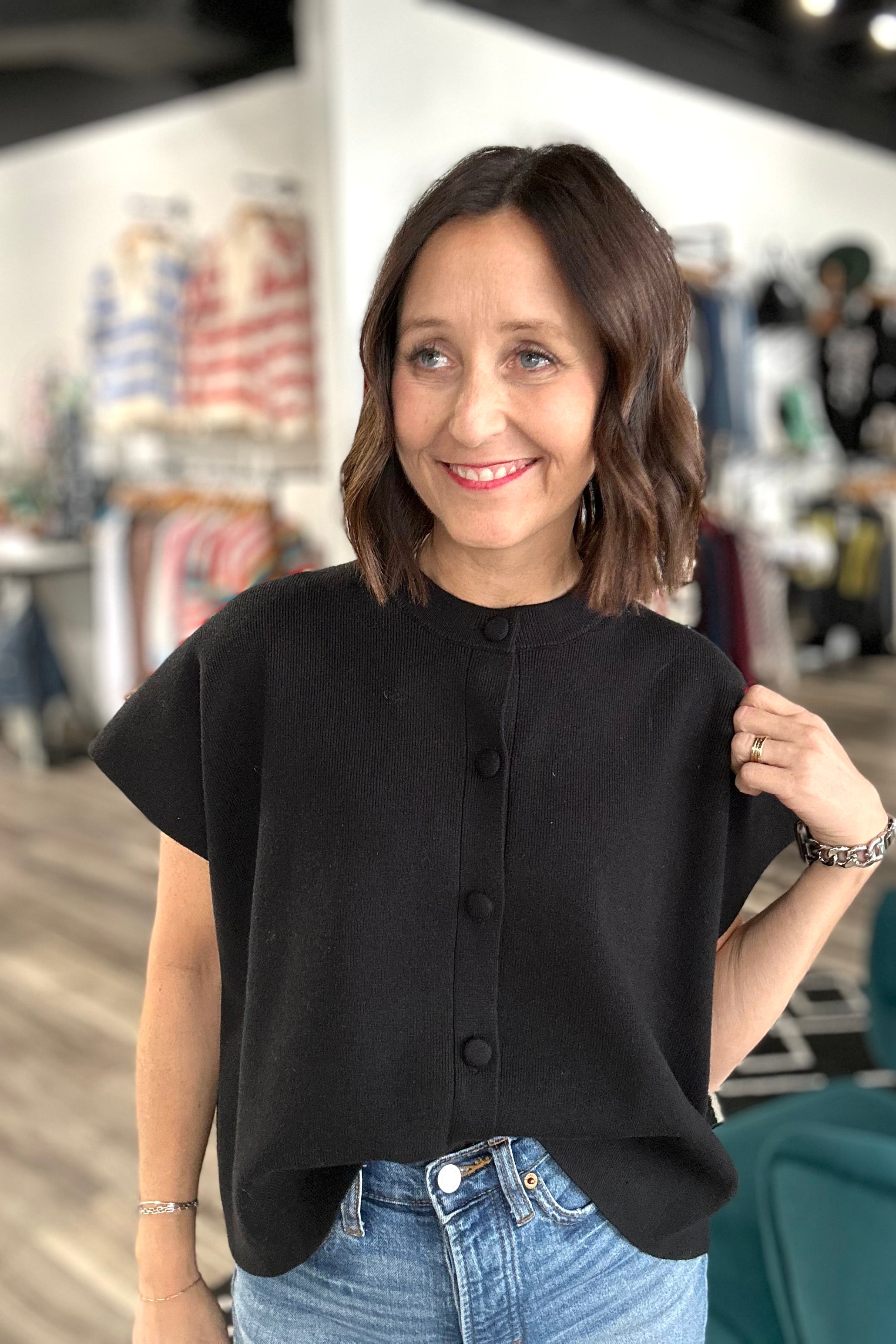The Mollie Cap Sleeve Button Down is your new wardrobe MVP—dress it up as a polished vest over your favorite dress, or rock it solo as a chic standalone top. Crafted in sleek black with charming fabric buttons and a boxy silhouette that flatters every frame, this piece brings effortless elegance to any outfit. Versatile, classy, and endlessly stylish.