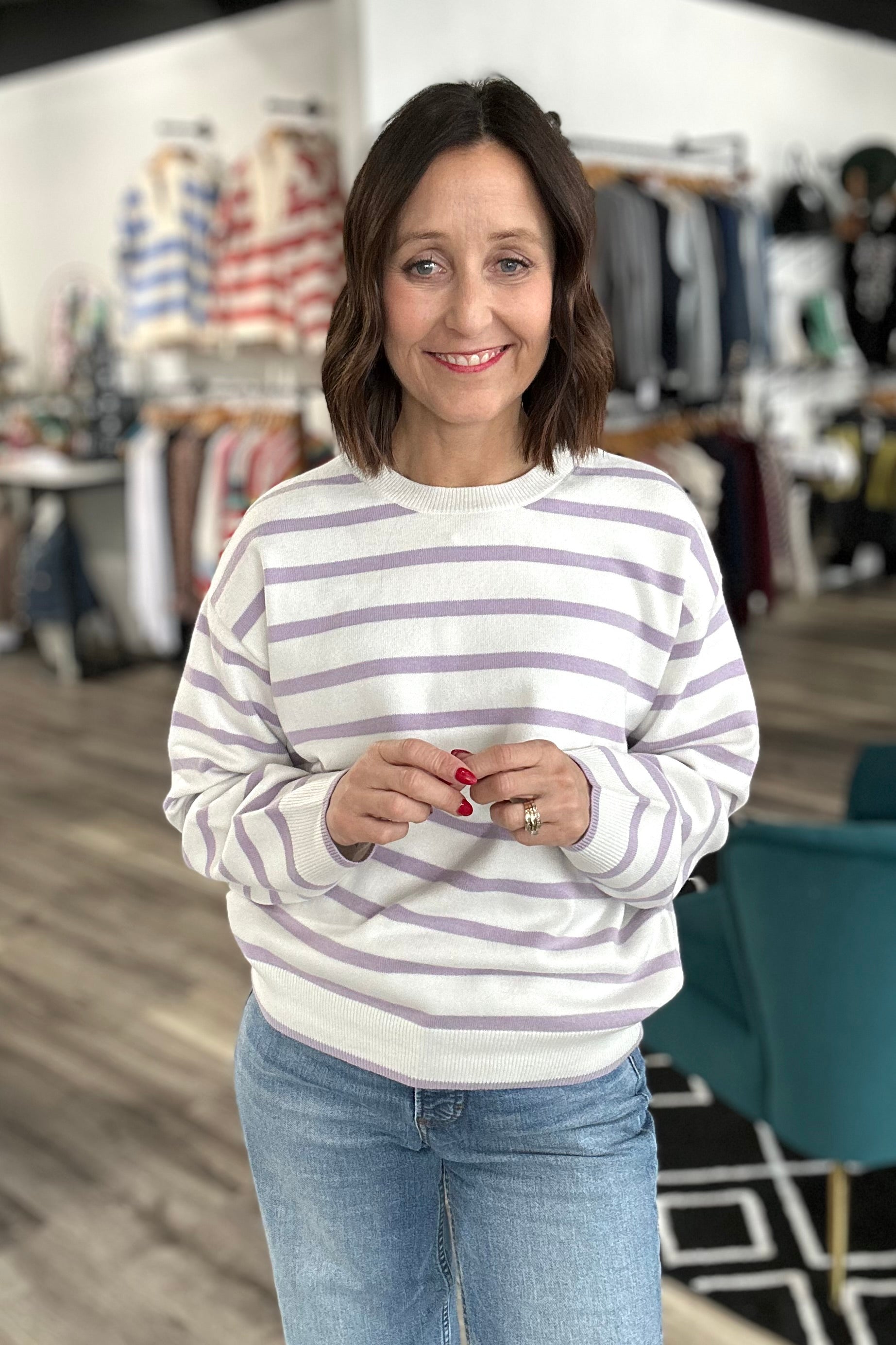 Stripes never go out of style—especially when they're this charming! The Preston Striped Sweater pairs soft lavender and crisp white stripes in a lightweight crewneck design that's perfect for layering or wearing solo. Breathable and breezy, it's your new go-to for effortless style that works from season to season. Cozy without the bulk, this sweater brings personality to any outfit.