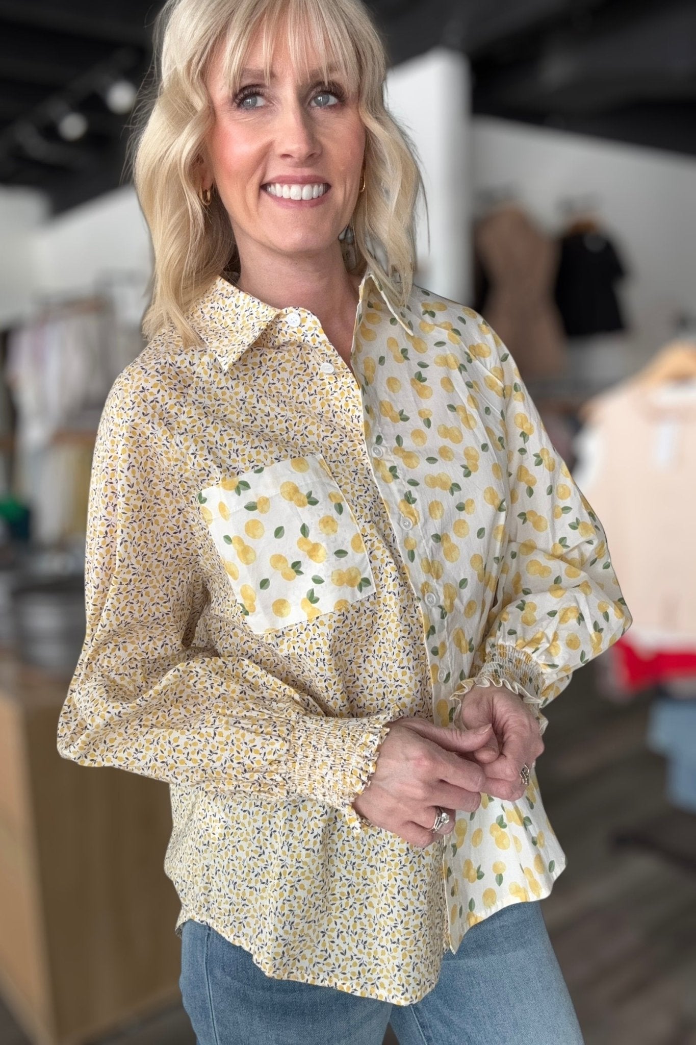 Brighten your spring wardrobe with this cheerful lemon print button-down top. Featuring a playful citrus design perfect for the season, this piece combines style with everyday comfort. The classic chest pocket adds practical detail, while the fun print makes it an instant conversation starter. Ideal for casual outings, weekend brunches, or layering over your favorite basics. A versatile essential that brings sunshine to any outfit.Details