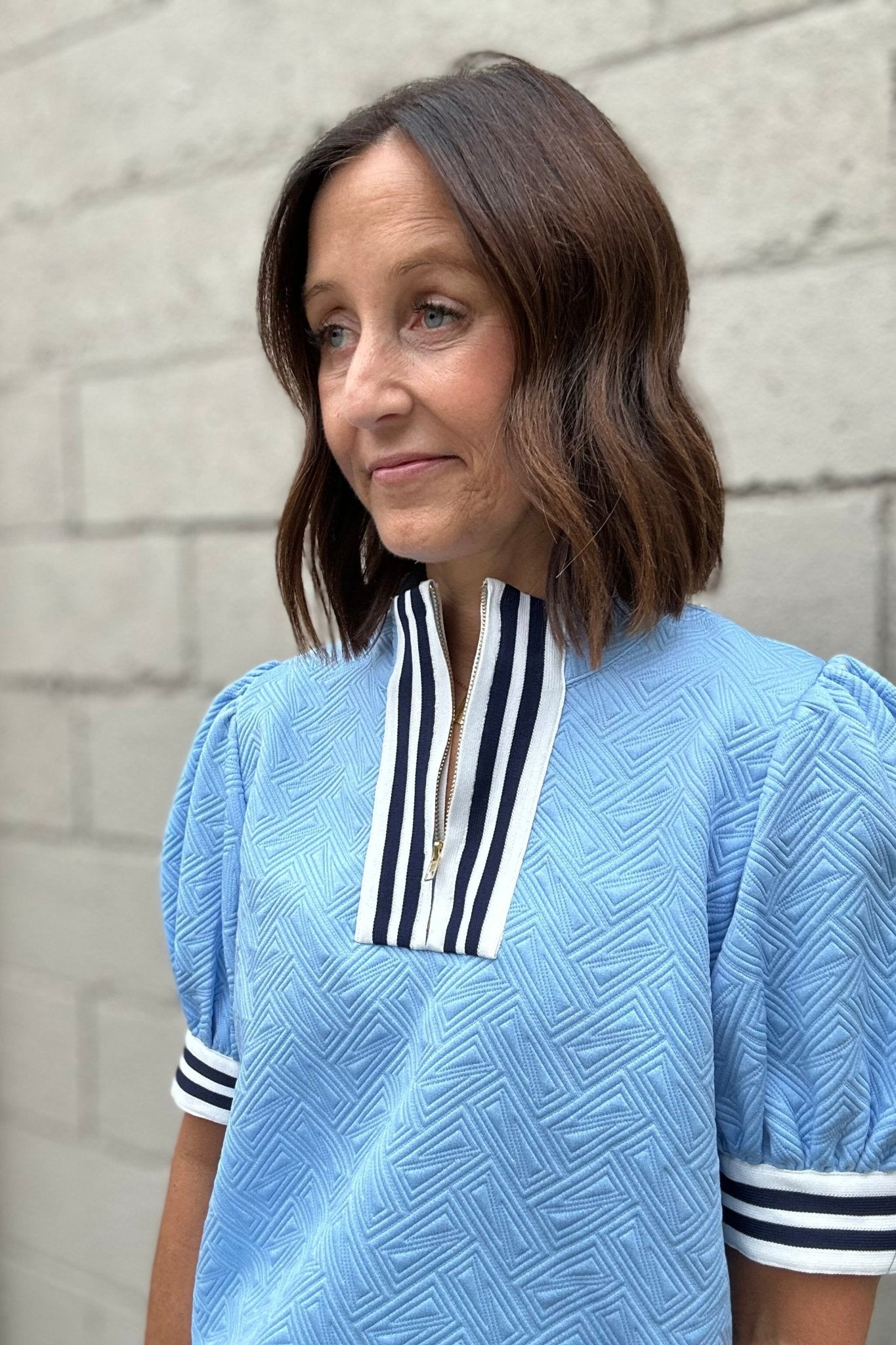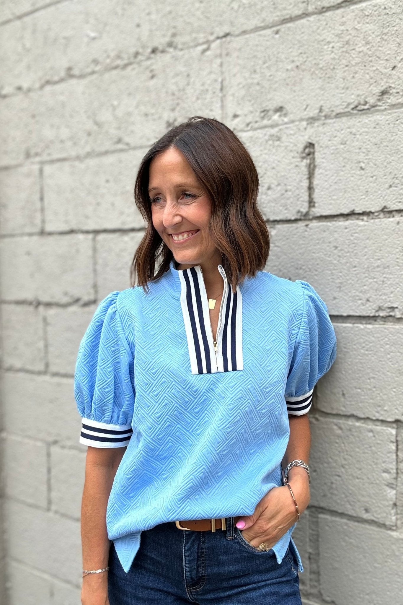 Add a splash of fun to your wardrobe with the Georgia Blue Top! This light blue blouse features playful puff sleeves and a half-zip V-neck for a breezy, stylish vibe. The geometric patterned fabric keeps things interesting, while black and white striped knit trim on the collar and sleeves adds a cheeky contrast. Perfect for those who love a little flair with comfort!