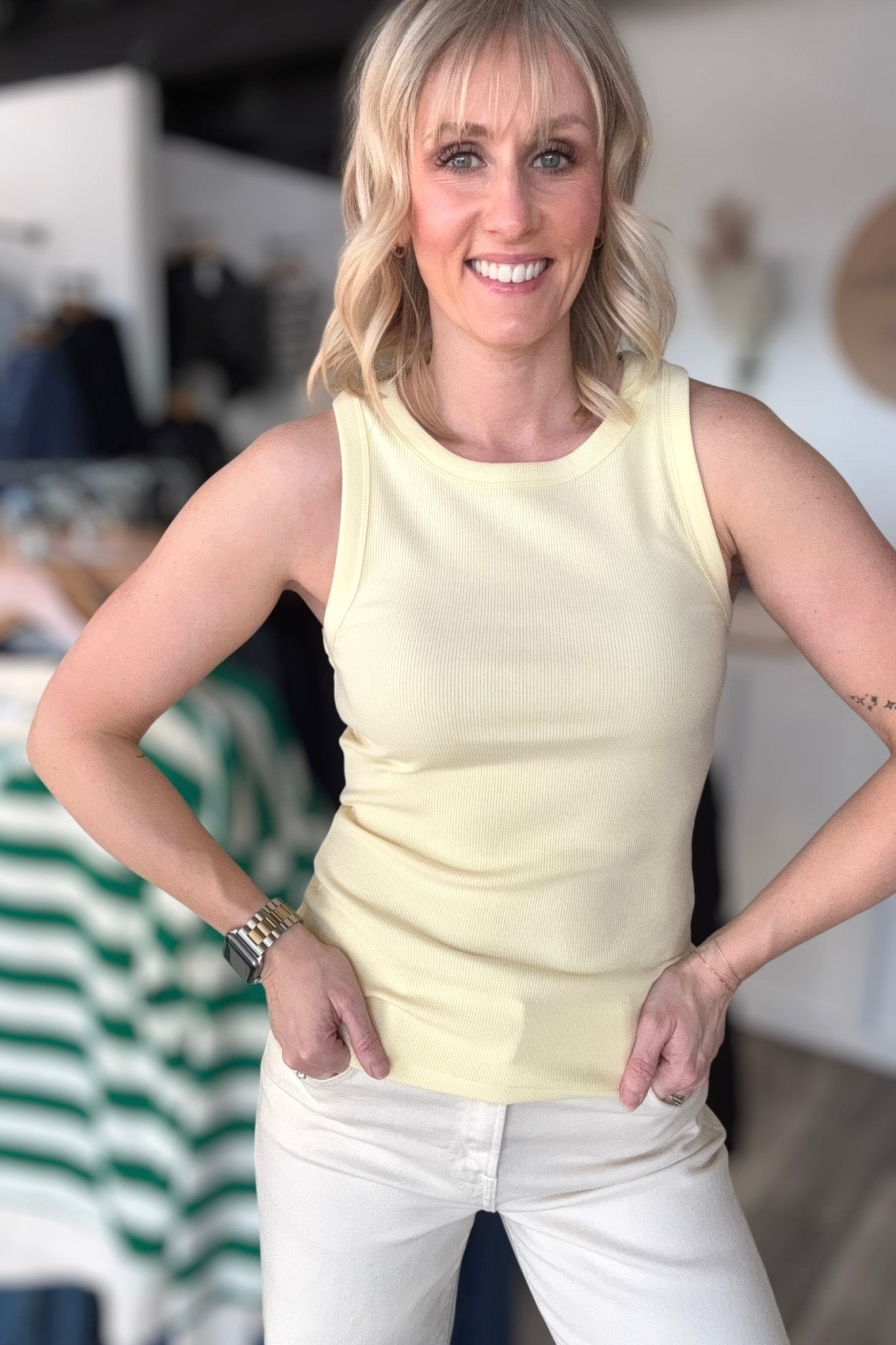 Butter yellow never looked so good. This ribbed tank features thicker straps and a classic round neck that works over time. Layer it under everything or let it shine solo. The longer torso length keeps you covered while the relaxed fit transitions seamlessly from casual weekend vibes to dressed-up evenings. Perfect for summer, this versatile essential proves that sometimes the simplest pieces make the biggest impact.