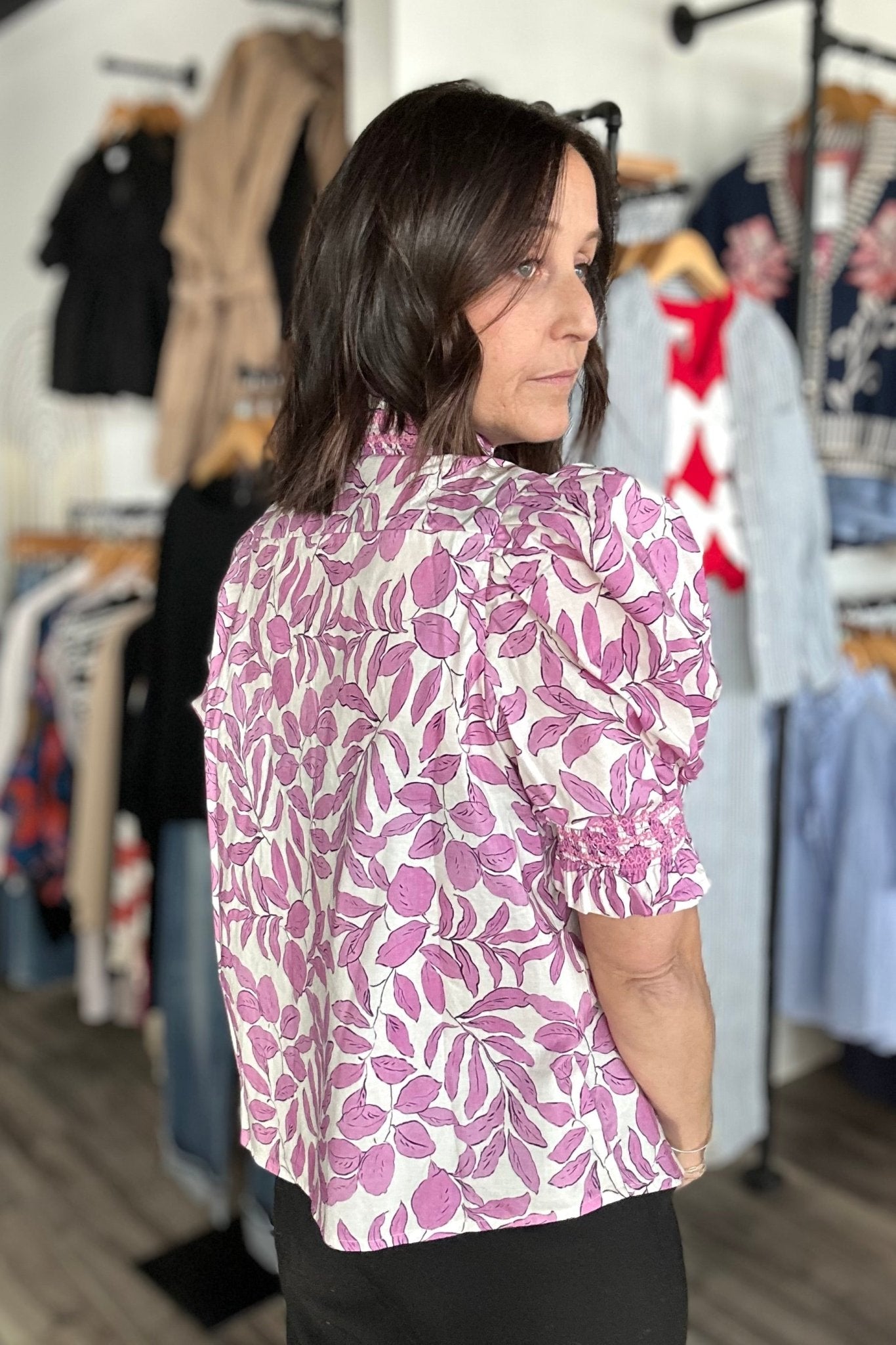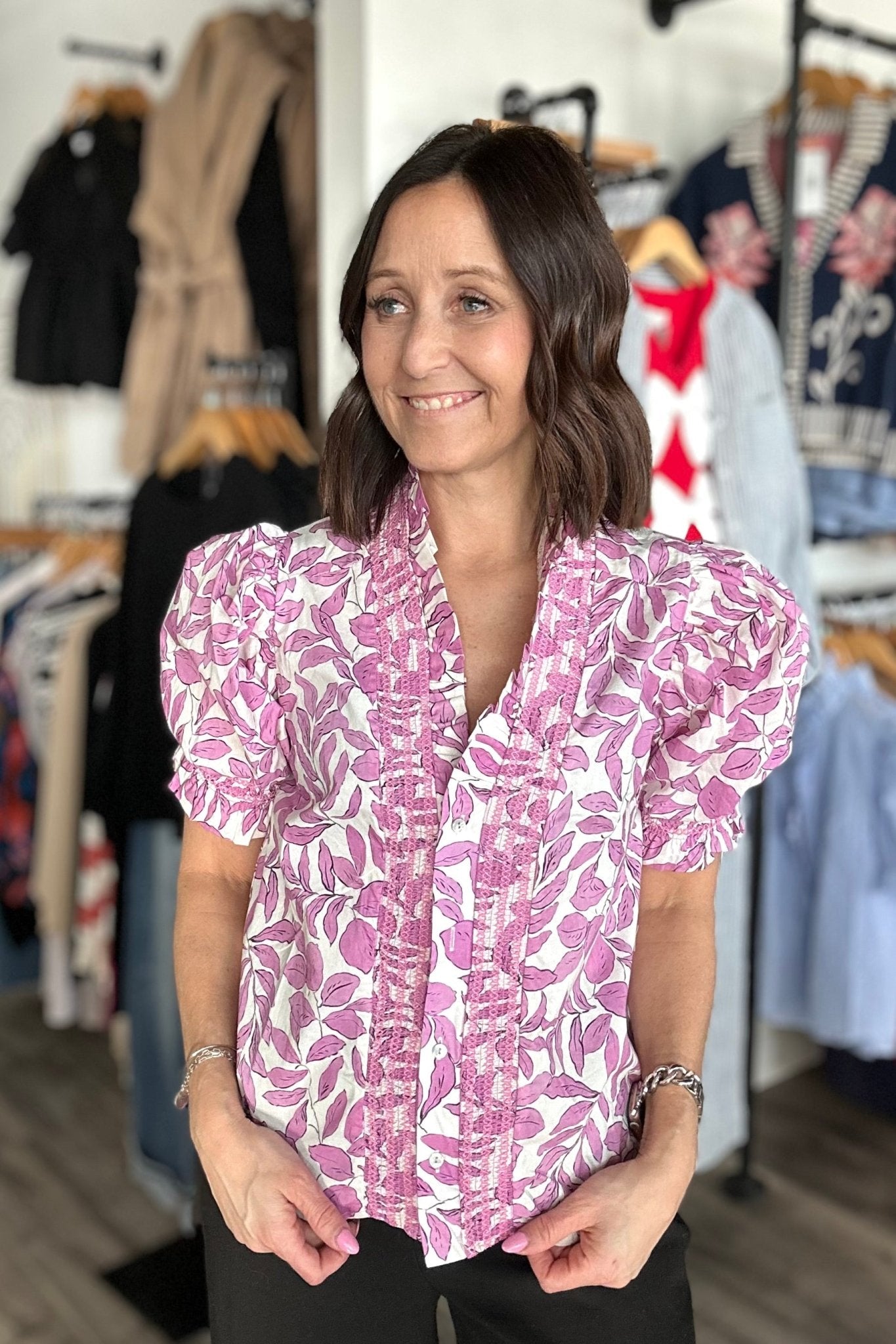 The Leanne Pink Ruffle Smocked Blouse is your new go-to for effortless style that works everywhere. Featuring charming puffed short sleeves, a flattering V-neck, and delicate ruffles throughout, this blouse brings personality to any outfit. The crisp white base pairs beautifully with a bold pink floral leaf pattern, while visible stitching details add a handcrafted touch that elevates the whole look. Whether you're dressing up for brunch, heading to the office, or keeping it casual on the weekend, this versatile piece adapts to your vibe. It's the kind of blouse that makes getting dressed fun—playful enough to feel special, polished enough to wear anywhere.