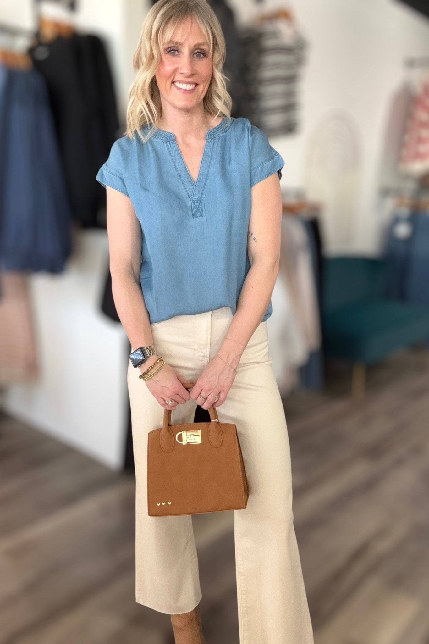 Effortless style meets comfort in this lightweight chambray top. The classic v-neckline and short sleeves make it perfect for layering or wearing solo—ideal for casual days when you want to look put-together without trying too hard. Soft, breathable fabric keeps you cool and comfortable all day long. A wardrobe staple that works as hard as you do.