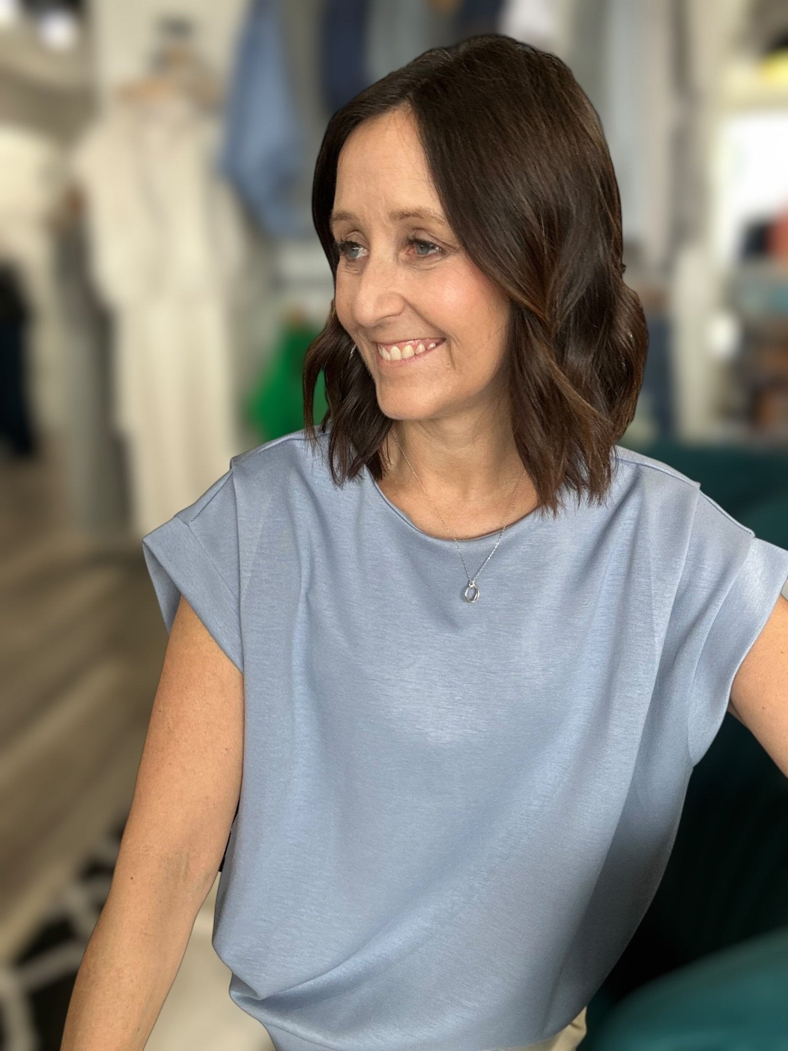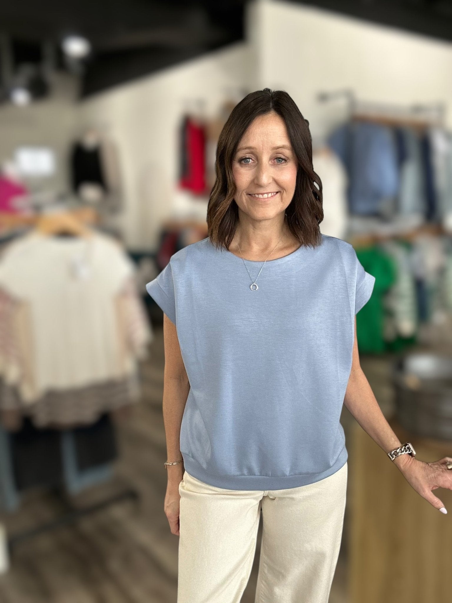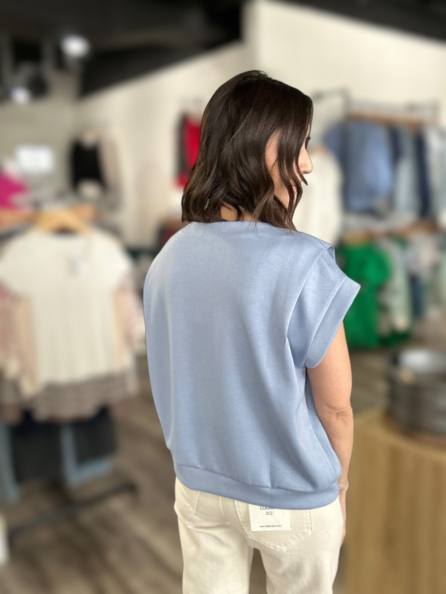 Elevate your date night look with the Sandi Blue Brushed Modal Pleated Top. Crafted from soft, brushed modal fabric, this light blue top features elegant pleating at the shoulders and short sleeves for a refined, feminine silhouette. The smooth drape and thoughtful design details make it perfect for special occasions or nights out. Available in multiple sizes with a flattering fit that works for various body types