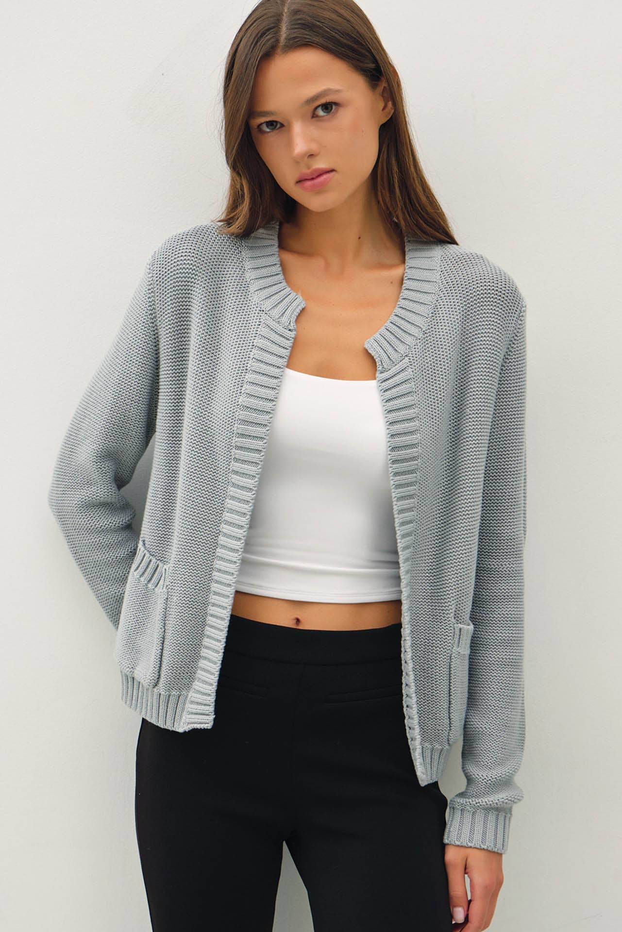 Layer up with effortless charm in this knit cardigan that's equal parts cozy and cute. The open front design pairs perfectly with everything in your closet, while long sleeves and a classic round neckline keep things preppy and polished. Ribbed edges add a refined finish, and practical front patch pockets are perfect for stashing essentials. Cut above the hip for a flattering silhouette that works with jeans, skirts, or dresses. Your new go-to piece for casual elegance.