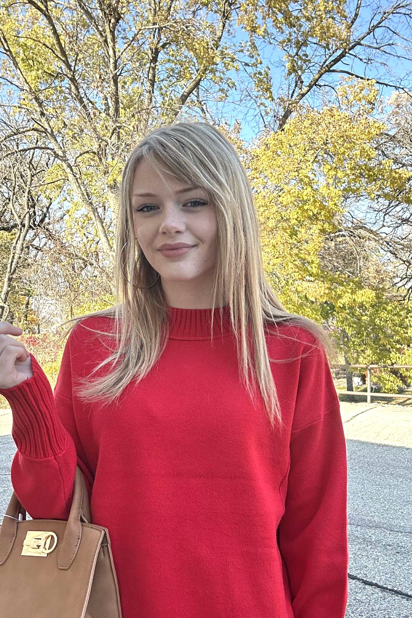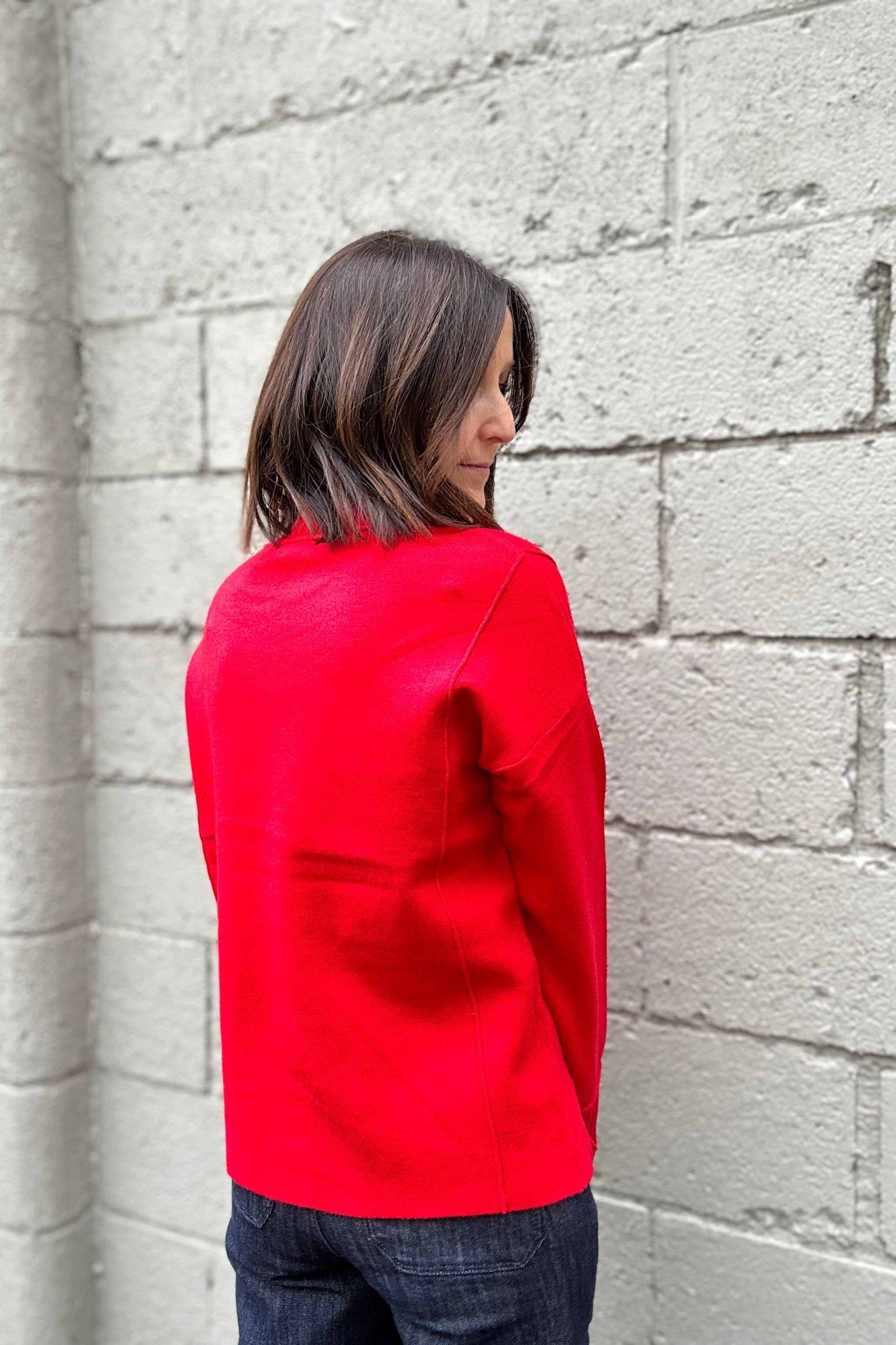 Elevate your sweater game with this striking red pullover that's full of personality! The mock neckline and double-length, ribbed cuffs create a coordinated, intentional look that feels put together. Decorative stitching details on the upper sleeves add an unexpected touch of flair, while the split hem—longer in back, shorter in front—gives you that modern, playful silhouette. Layer it, tuck it, or wear it loose; this piece is designed to turn heads.