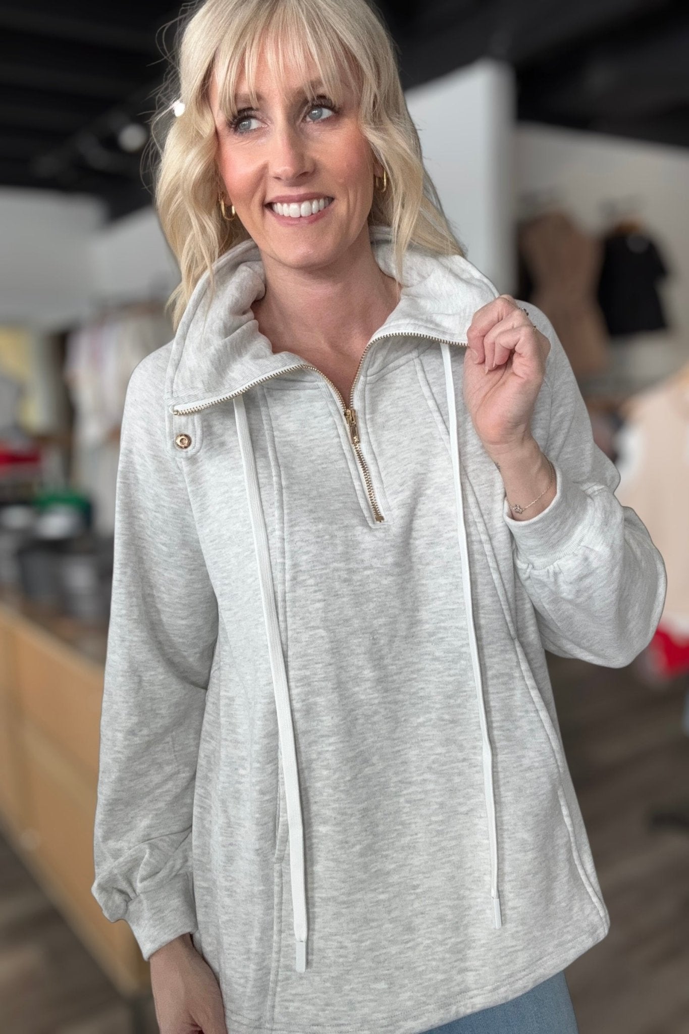 Elevate your casual wardrobe with this versatile grey pullover sweatshirt. Crafted in soft heather grey, it features your choice of a mock neck or a folded collar, paired with a front half-zip for easy layering. Gold hardware accents the design, while adjustable drawstrings at the neckline add both function and style. Long sleeves and a slightly oversized silhouette with an extended hem create a modern, relaxed fit that works for any season.