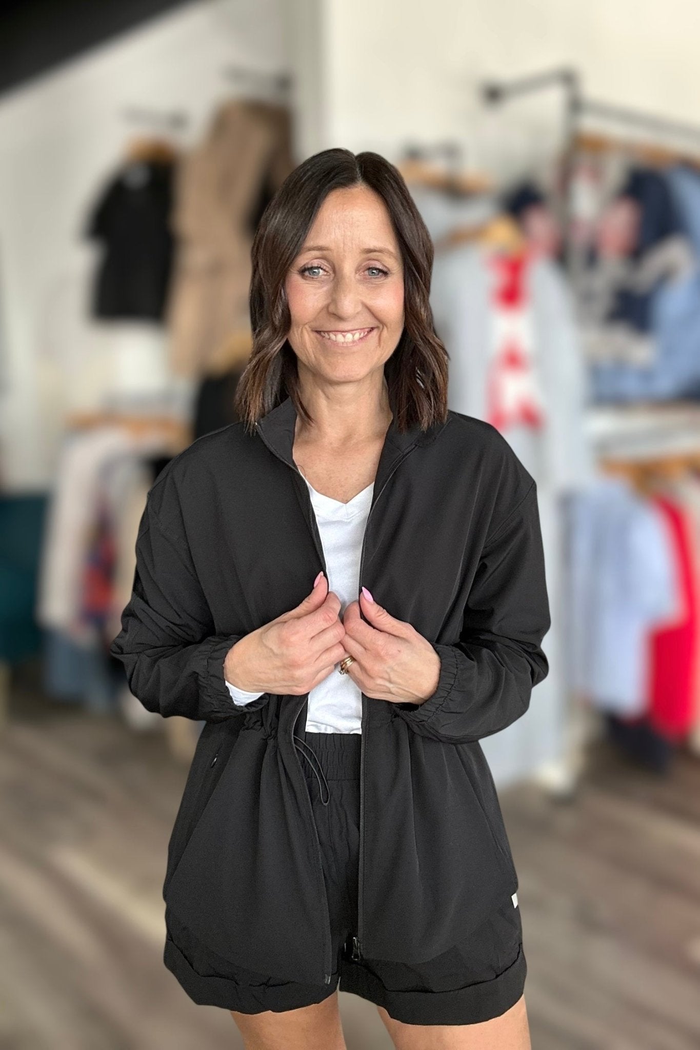 The Megan Cinch Peplum Jacket is your new go-to for effortless style that actually flatters. This sleek black jacket features adjustable hidden drawstrings at the waist and cinched sleeve cuffs that let you dial in the perfect fit—whether you're going for sporty chic or polished casual. The versatile folded collar works as a classic neckline or transforms into a cozy mock neck for extra warmth and attitude. Long sleeves and a figure-hugging silhouette make this piece as cute as it is practical, ready to elevate everything from weekend outfits to dressed-up looks. Zip up and cinch in; this jacket is your new favorite layering piece.
