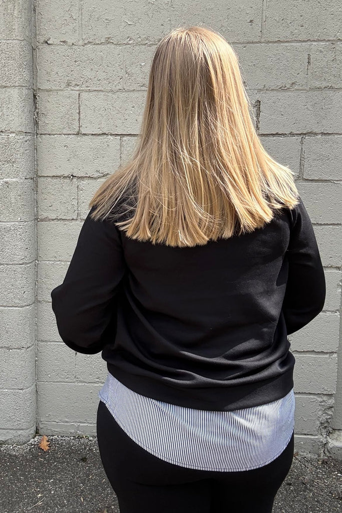 Bring playful charm to your wardrobe with the Kerry Knit Top. This clever layered look features a navy pullover sweater with a pinstriped, collared shirt peeking out at the neckline and hem, creating a fun, polished style without the hassle of layering. Perfect for adding a dash of casual sophistication to any outfit.